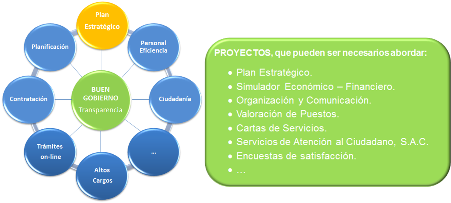 El Buen Gobierno en las Administraciones Públicas (Ley 19/2013) enfatiza la Transparencia, concretándolo en los artículos 6, 7 y 8, relativos a la información institucional, jurídica y económica. La Transparencia se convierte así en uno de los pilares de la Gestión Pública, que puede ser desarrollada  incluyéndola en  el Plan Estratégico, que  proponga Objetivos, Acciones a llevar a cabo, su Control y la Evaluación del grado de Ejecución y Transparencia alcanzados.Algunos aspectos,  sobre los que trabajar, con el criterio de Transparencia, en el ámbito del Buen Gobierno, son  los siguientes: