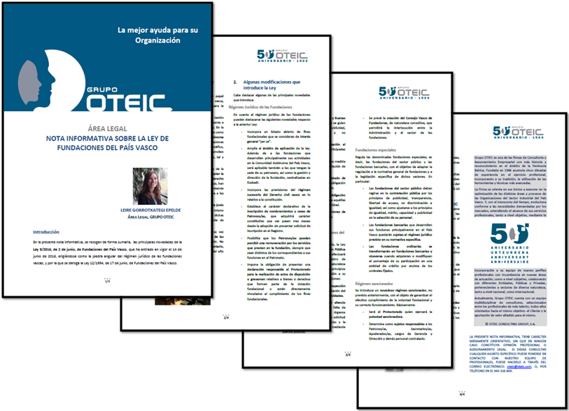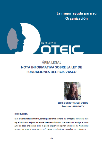 Elaborada por el Área Legal de Grupo OTEIC, en la presente nota informativa, se recogen de forma sumaria, las principales novedades de la Ley 9/2016, de 2 de junio, de Fundaciones del País Vasco, que ha entrado en vigor el 14 de junio de 2016, erigiéndose como la piedra angular del régimen jurídico de las fundaciones vascas, y por la que se deroga la Ley 12/1994, de 17 de junio, de Fundaciones del País Vasco.