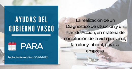 El Departamento de Igualdad, Justicia y Políticas Sociales pone a disposición de las empresas con plantilla de entre 10 y 250 personas, ayudas de hasta 10.000 euros, para la elaboración de un Diagnóstico de Situación y Plan de Acción en materia de conciliación personal, familiar y laboral.