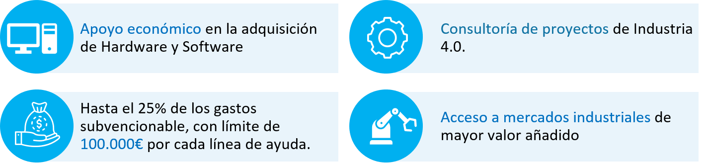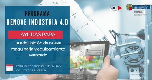 Les informamos sobre el Programa RENOVE INDUSTRIA 4.0, orientado a fomentar las inversiones en nueva maquinaria y equipamiento avanzado (hardware y software), con el objetivo de modernizar los entornos industriales para que puedan abordar los retos de la Industria 4.0, a través de dos líneas de actuación: